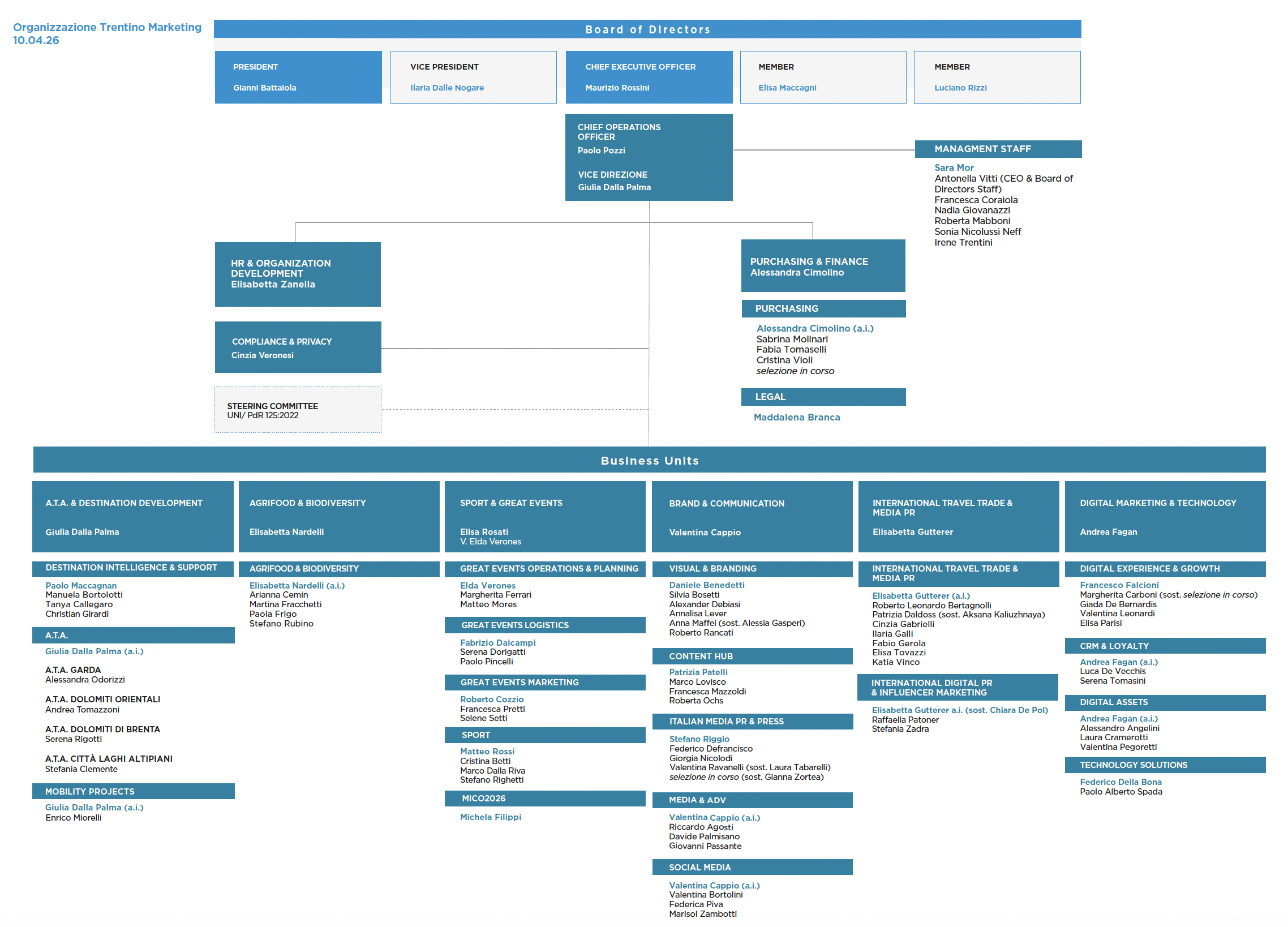 Attua la strategia aziendale per lo sviluppo dei business aziendali. E' responsabile della realizzazione complessiva dei piani di attività approvati dalla Provincia autonoma di Trento, coordinandone strategie e progetti nel rispetto delle risorse economiche assegnate.