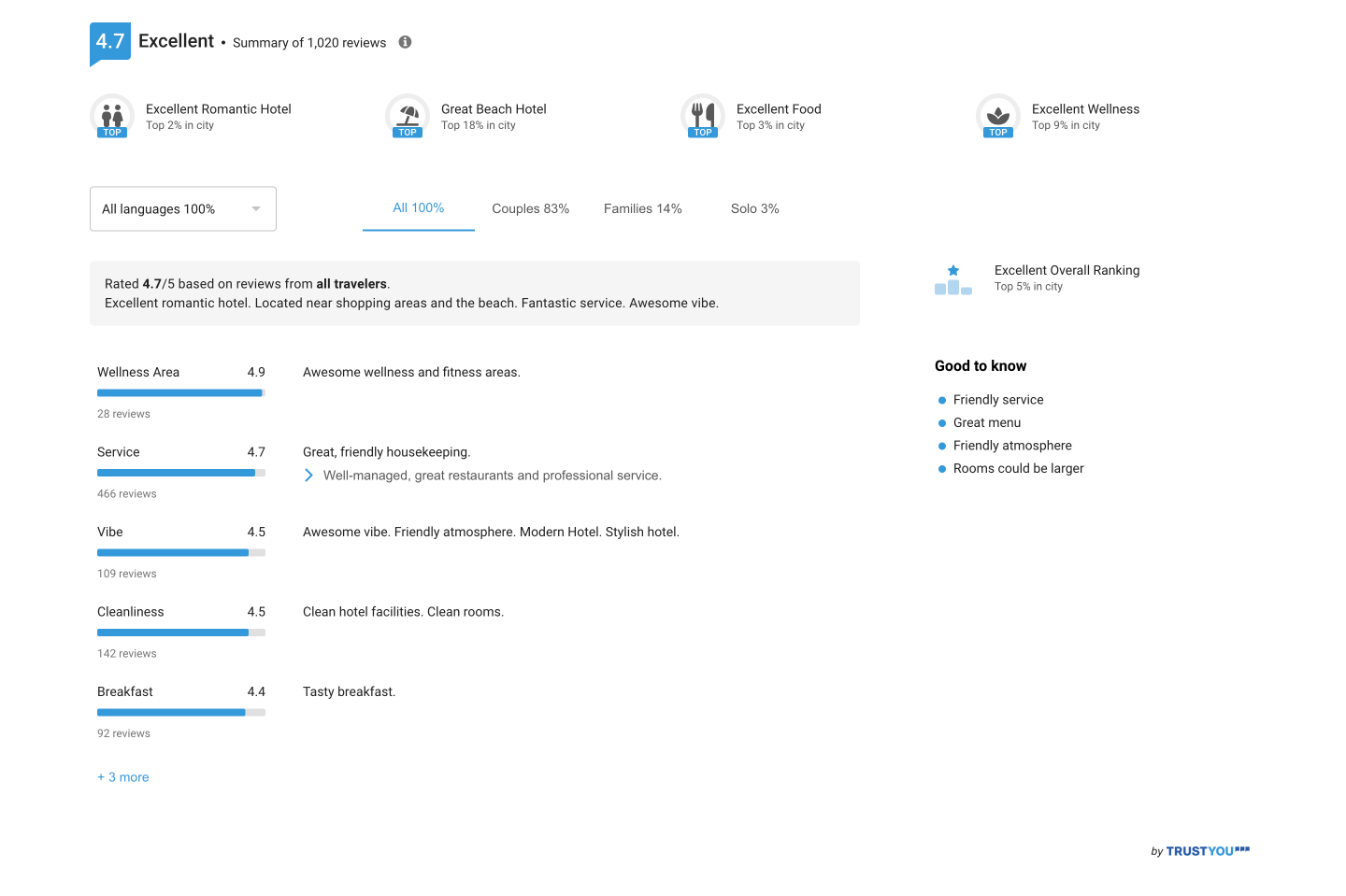 Metti in evidenza il punteggio e le recensioni dei tuoi ospiti scaricando gratuitamente il widget di TrustYou sul tuo sito!