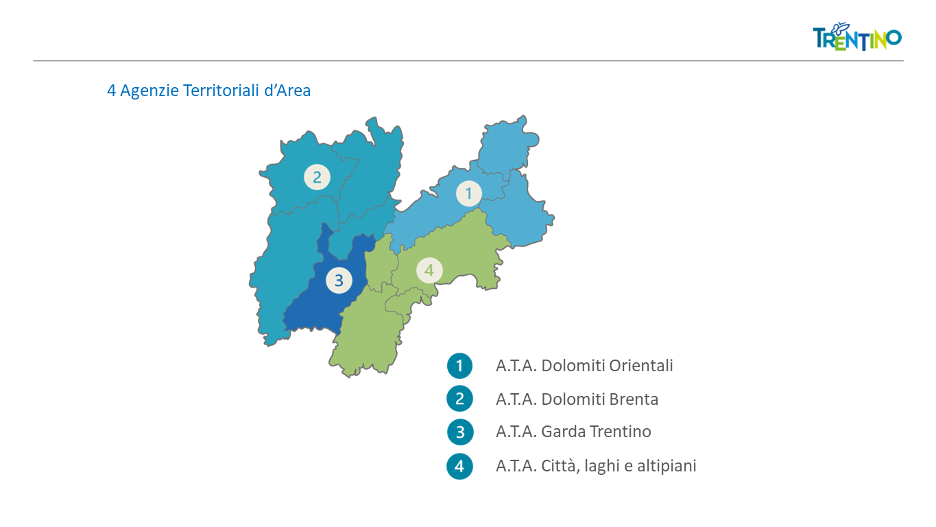 Le aree territoriali individuate dalla legge (art. 8 e art. 16 comma 8 della LP 8/2020 e Delibera della Giunta provinciale n° 520), denominate Agenzie Territoriali d’Area (A.T.A.) e coordinate da Trentino Marketing con un’area ad esse dedicata, comprendono più APT d’ambito geograficamente connesse.
