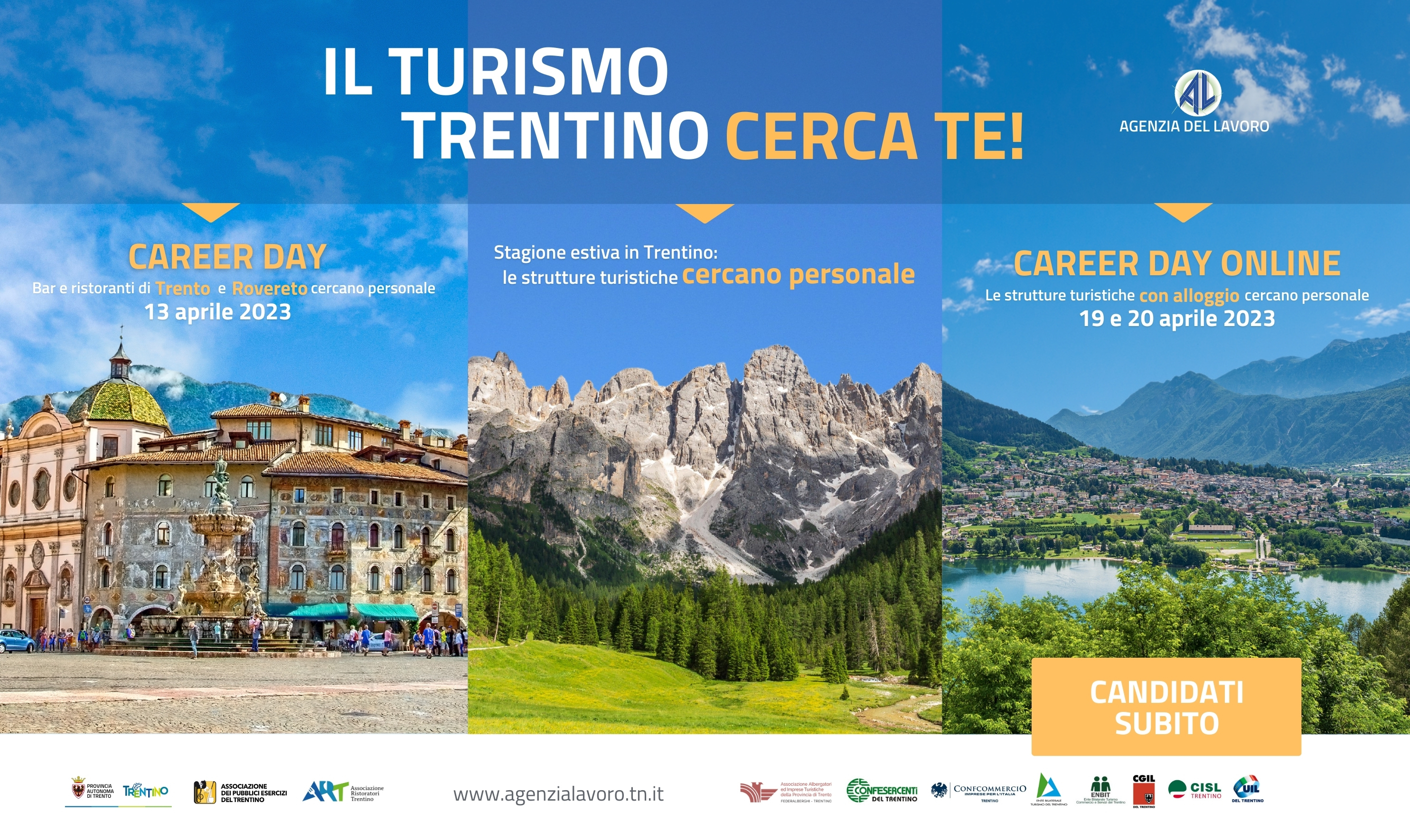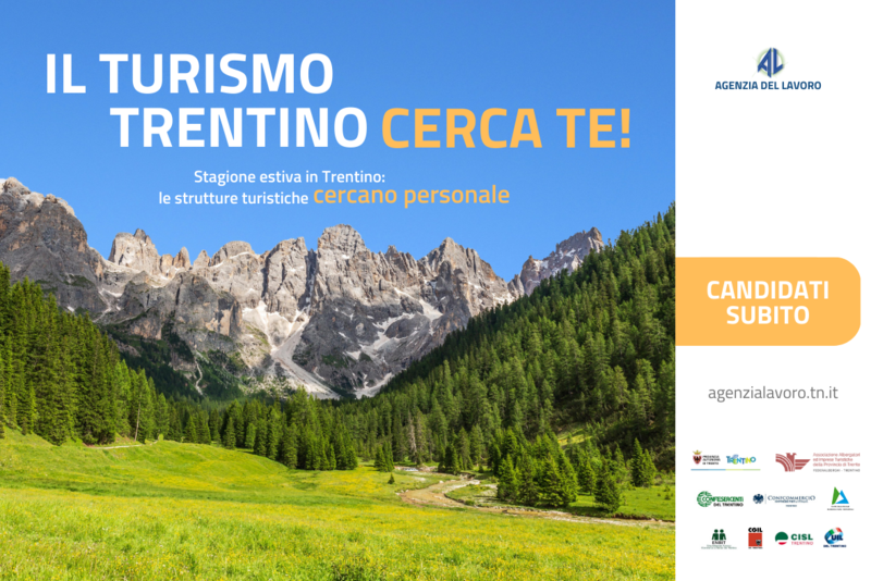 Agenzia del Lavoro della Provincia di Trento ha lanciato l’ormai consolidata campagna dal titolo “IL TURISMO TRENTINO CERCA TE” al fine di mettere in contatto lavoratori disponibili a lavorare nel settore con gli operatori turistici (alberghi, bar, ristoranti, pizzerie etc) che sono alla ricerca di personale: i profili ricercati per la stagione turistica 2023 spaziano dalla cucina al ricevimento, dalla sala, bar e piani al wellness.