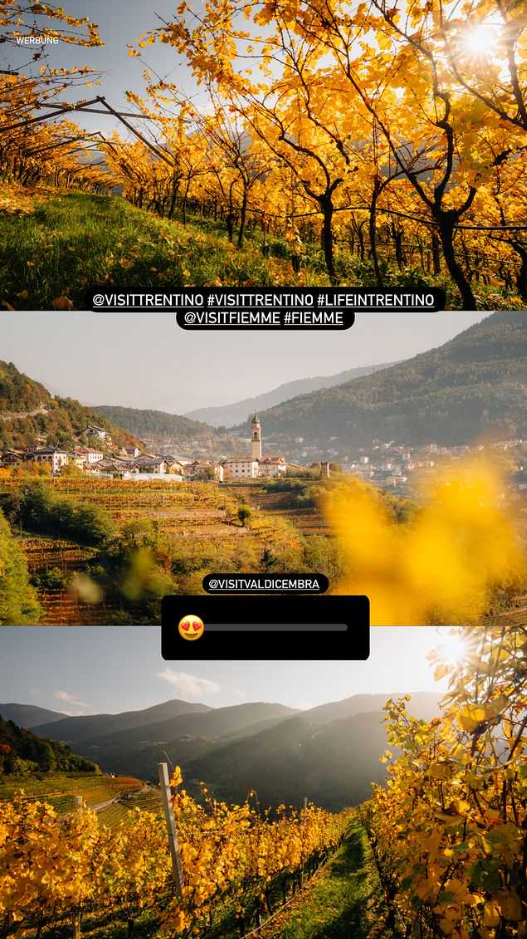 Per entrambi, nei programmi di attività quotidiana, sono state previste specifiche uscite sui sentieri di media montagna a caccia degli spot fotografici più suggestivi (tra i tanti: nella zona del lago Santo, nell’area del Fuciade ed in val Duron, sul Lagorai, in val di Rabbi), ma senza trascurare le opportunità del turismo slow autunnale, con visite a borghi e castelli. Anche in questo caso è stato chiesto agli influencer di realizzare contenuti sui rispettivi profili ed anche alcuni contenuti per alimentare i profili social di Visittrentino, in vari formati (foto, video, immagini dal drone). Le performance dei circa 30 contenuti postati dai creator i giorni scorsi, per quanto provvisorie ed in via di aggiornamento, sono già soddisfacenti, con un engagement complessivo che sfiora già i 50k.