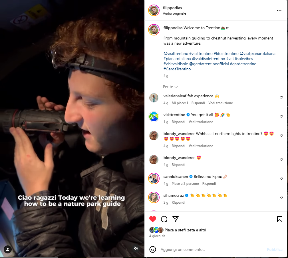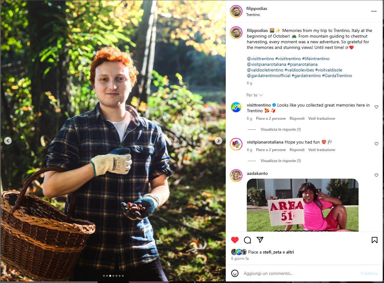 Lo scandinavo Filippo Dias @filippodias è stato il primo a raggiungerci durante la seconda settimana del mese di ottobre, alla scoperta delle bellezze della Val di Sole, Piana Rotaliana e Garda Trentino. Per lui, in particolare, è stato creato un programma ad hoc per raccontare i mondi che le nostre storie di campagna aprono. Con il format “A day as…” il simpaticissimo Filippo, di volta in volta, si è trovato ad indossare i panni di Guida Alpina sulla ferrata del Burrone Giovanelli, di Guardia Parco del Parco Nazionale dello Stelvio ed anche di produttore di castagne alle prese con la raccolta, per un giorno intero. In meno di una settimana Filippo ha prodotto quasi 100 contenuti sui suoi canali IG e TikTok, con valori di reach e impression ancora in evoluzione ma già superiori ai 100k, oltre a realizzare 36 video clip ad hoc, da pubblicare sui nostri canali.