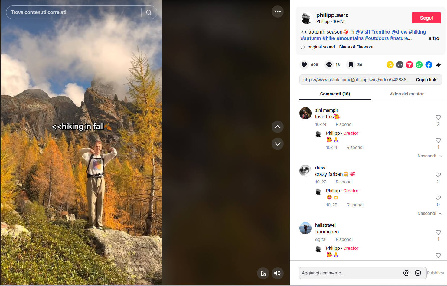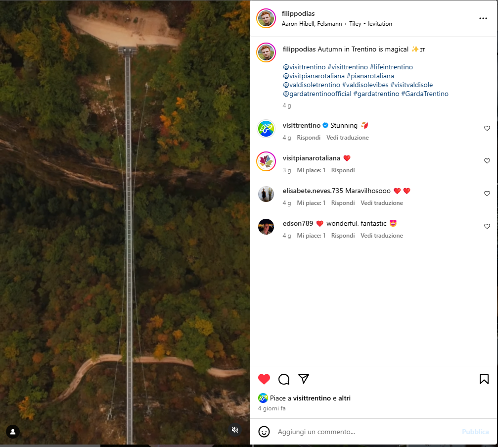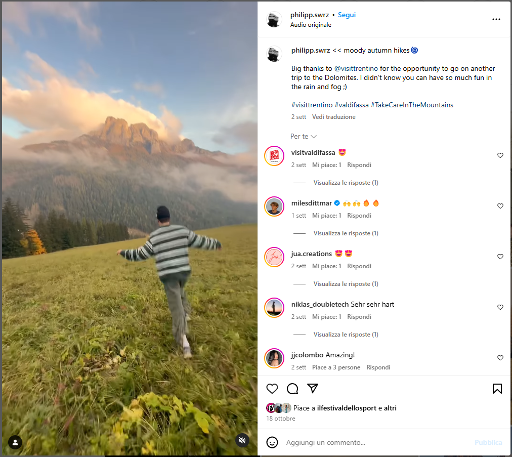 Gli ultimi giorni del mese, quelli migliori per immortalare il foliage autunnale nel suo momento di massima esplosione, abbiamo avuto, invece, ospiti una coppia di giovani tiktoker provenienti dall’area “DACH”, Philipp Schwarz @philipp.swrz in val di Fassa e Valsugana, e Lukas Richter @_lukasrichter ospitato in val di Fiemme e Cembra ed in val di Sole.